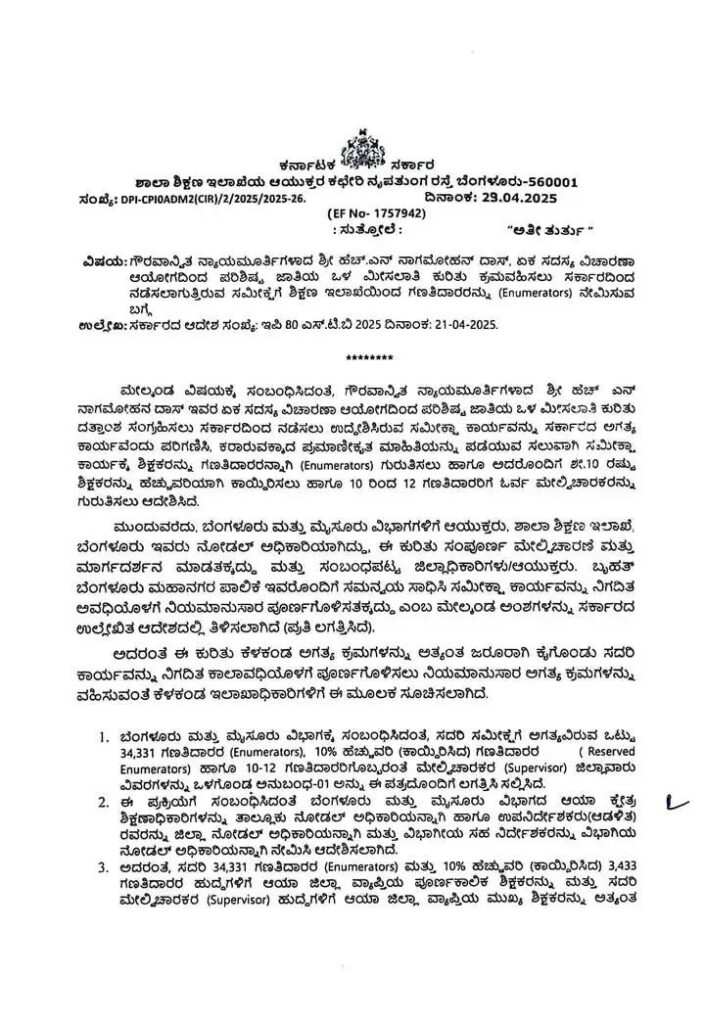 ಗೌರವಾನ್ವಿತ ನ್ಯಾಯಮೂರ್ತಿಗಳಾದ ಶ್ರೀ ಹೆಚ್ ಎನ್ ನಾಗಮೋಹನ ದಾಸ್ ಇವರ ಏಕ ಸದಸ್ಯ ವಿಚಾರಣಾ ಆಯೋಗದಿಂದ ಪರಿಶಿಷ್ಟ ಜಾತಿಯ ಒಳ ಮೀಸಲಾತಿ ಕುರಿತು ದತ್ತಾಂಶ ಸಂಗ್ರಹಿಸಲು ಸರ್ಕಾರದಿಂದ ನಡೆಸಲು ಉದ್ದೇಶಿಸಿರುವ ಸಮೀಕ್ಷಾ ಕಾರ್ಯವನ್ನು ಸರ್ಕಾರದ ಅಗತ್ಯ ಕಾರ್ಯವೆಂದು ಪರಿಗಣಿಸಿ, ಕರಾರುವಕ್ಕಾದ ಪ್ರಮಾಣೀಕೃತ ಮಾಹಿತಿಯನ್ನು ಪಡೆಯುವ ಸಲುವಾಗಿ ಸಮೀಕ್ಷಾ ಕಾರ್ಯಕ್ಕೆ ಶಿಕ್ಷಕರನ್ನು ಗಣತಿದಾರರನ್ನಾಗಿ (Enumerators) ಗುರುತಿಸಲು ಹಾಗೂ ಅದರೊಂದಿಗೆ ೫.10 ರಷ್ಟು ಶಿಕ್ಷಕರನ್ನು ಹೆಚ್ಚುವರಿಯಾಗಿ ಕಾಯ್ದಿರಿಸಲು ಹಾಗೂ 10 ರಿಂದ 12 ಗಣತಿದಾರರಿಗೆ ಓರ್ವ ಮೇಲ್ವಿಚಾರಕರನ್ನು ಗುರುತಿಸಲು ಆದೇಶಿಸಿದ.