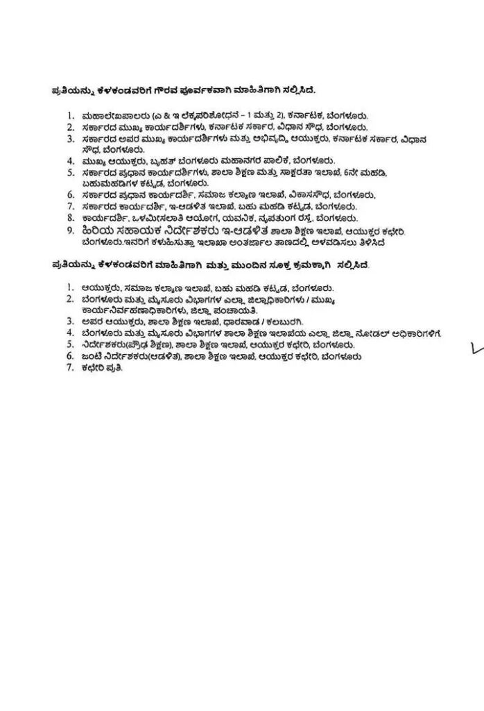 ಮುಂದುವರೆದು, ಬೆಂಗಳೂರು ಮತ್ತು ಮೈಸೂರು ವಿಭಾಗಗಳಿಗೆ ಆಯುಕ್ತರು, ಶಾಲಾ ಶಿಕ್ಷಣ ಇಲಾಖೆ, ಬೆಂಗಳೂರು ಇವರು ನೋಡಲ್ ಅಧಿಕಾರಿಯಾಗಿದ್ದು, ಈ ಕುರಿತು ಸಂಪೂರ್ಣ ಮೇಲ್ವಿಚಾರಣೆ ಮತ್ತು ಮಾರ್ಗದರ್ಶನ ಮಾಡತಕ್ಕದ್ದು ಮತ್ತು ಸಂಬಂಧಪಟ್ಟ ಜಿಲ್ಲಾಧಿಕಾರಿಗಳು/ಆಯುಕ್ತರು. ಬೃಹತ್ ಬೆಂಗಳೂರು ಮಹಾನಗರ ಪಾಲಿಕೆ ಇವರೊಂದಿಗೆ ಸಮನ್ವಯ ಸಾಧಿಸಿ ಸಮೀಕ್ಷಾ ಕಾರ್ಯವನ್ನು ನಿಗದಿತ ಅವಧಿಯೊಳಗೆ ನಿಯಮಾನುಸಾರ ಪೂರ್ಣಗೊಳಿಸತಕ್ಕದ್ದು ಎಂಬ ಮೇಲ್ಕಂಡ ಅಂಶಗಳನ್ನು ಸರ್ಕಾರದ ಉಲ್ಲೇಖಿತ ಆದೇಶದಲ್ಲಿ ತಿಳಿಸಲಾಗಿದೆ (ಪ್ರತಿ ಲಗತ್ತಿಸಿದೆ).