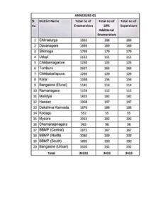 1. ಬೆಂಗಳೂರು ಮತ್ತು ಮೈಸೂರು ವಿಭಾಗಕ್ಕೆ ಸಂಬಂಧಿಸಿದಂತೆ, ಸದರಿ ಸಮೀಕ್ಷೆಗೆ ಅಗತ್ಯವಿರುವ ಒಟ್ಟು 34,331 ಗಣತಿದಾರರ (Enumerators), 10% ಹೆಚ್ಚುವರಿ (ಕಾಯ್ದಿರಿಸಿದ) ಗಣತಿದಾರರ (Reserved Enumerators) ಹಾಗೂ 10-12 ಗಣತಿದಾರರಿಗೊಬ್ಬರಂತೆ ಮೇಲ್ವಿಚಾರಕರ (Supervisor) ಜಿಲ್ಲಾವಾರು ವಿವರಗಳನ್ನು ಒಳಗೊಂಡ ಅನುಬಂಧ-01 ಅನ್ನು ಈ ಪತ್ರದೊಂದಿಗೆ ಲಗತ್ತಿಸಿ ಸಲ್ಲಿಸಿದೆ.