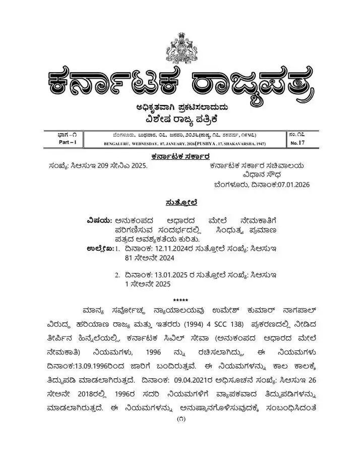 ಮಾನ್ಯ ಸರ್ವೋಚ್ಛ ನ್ಯಾಯಾಲಯವು ಉಮೇಶ್ ಕುಮಾರ್ ನಾಗಪಾಲ್ ವಿರುದ್ಧ ಹರಿಯಾಣ ರಾಜ್ಯ ಮತ್ತು ಇತರರು (1994) 4 SCC 138 ಪ್ರಕರಣದಲ್ಲಿ ನೀಡಿದ ತೀರ್ಪಿನ ಹಿನ್ನೆಲೆ ಯಲ್ಲಿ ಕರ್ನಾಟಕ ಸಿವಿಲ್ ಸೇವಾ (ಅನುಕಂಪದ ಆಧಾರದ ಮೇಲೆ ನೇಮಕಾತಿ) ನಿಯಮಗಳು, 1996 ರಚಿಸಲ್ಪಟ್ಟಿದ್ದು, ಈ ನಿಯಮಗಳು 13-09-1996ರಿಂದ ಜಾರಿಗೆ ಬಂದಿವೆ. ಈ ನಿಯಮಗಳಿಗೆ ಕಾಲಕಾಲಕ್ಕೆ ತಿದ್ದುಪಡಿ ಮಾಡಲಾಗಿದ್ದು, ಇತ್ತೀಚೆಗೆ ದಿನಾಂಕ 09-04-2021ರ ಅಧಿಸೂಚನೆಯ ಮೂಲಕ ವ್ಯಾಪಕ ತಿದ್ದುಪಡಿಗಳನ್ನು ಜಾರಿಗೆ ತರಲಾಗಿದೆ.