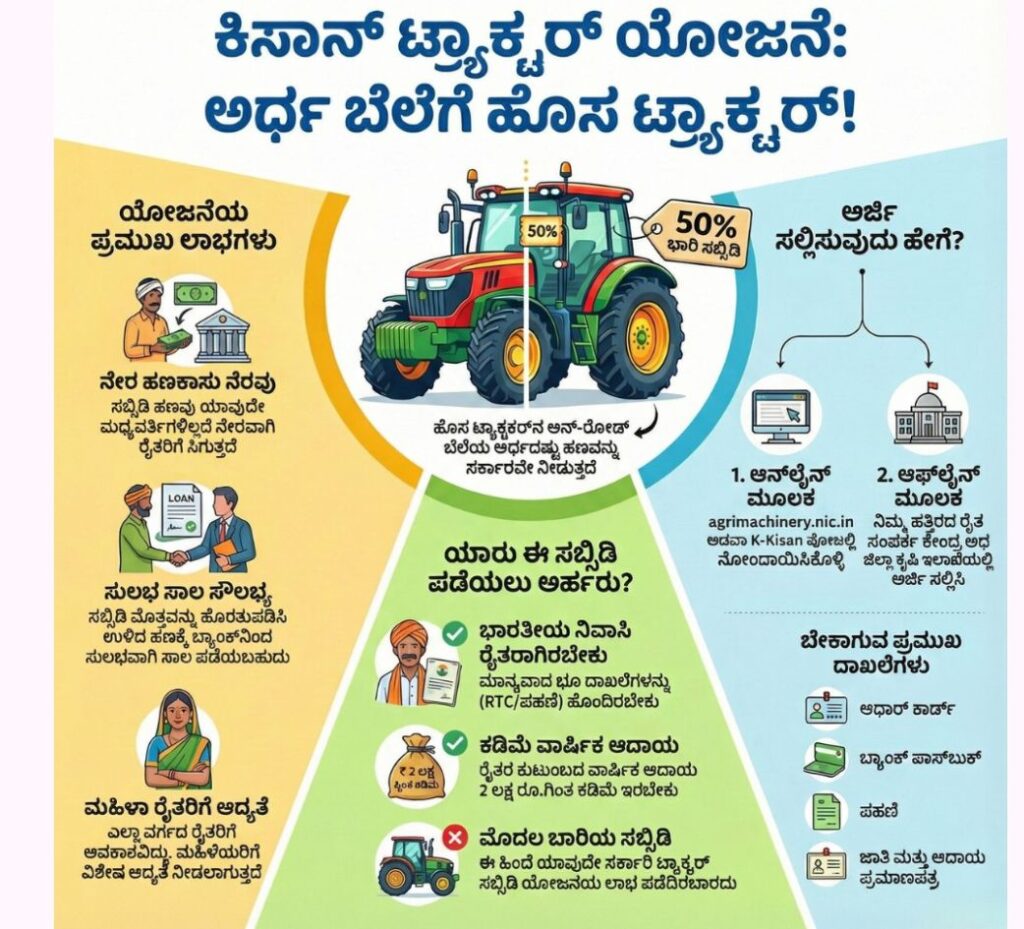 ಕೃಷಿಯಲ್ಲಿ ಯಂತ್ರೋಪಕರಣಗಳ ಬಳಕೆ ಇಂದಿನ ಅಗತ್ಯವಾಗಿದ್ದು, ಹೊಸ ಟ್ರ್ಯಾಕ್ಟರ್ ಖರೀದಿ ಸಾಮಾನ್ಯ ರೈತರಿಗೆ ದೊಡ್ಡ ಆರ್ಥಿಕ ಹೊರೆ ಆಗುತ್ತಿದೆ. ಇದನ್ನು ಮನಗಂಡು ಕೇಂದ್ರ ಸರ್ಕಾರವು ಕಿಸಾನ್ ಟ್ರ್ಯಾಕ್ಟರ್ ಯೋಜನೆ ಮೂಲಕ ರೈತರಿಗೆ ಟ್ರ್ಯಾಕ್ಟರ್ ಆನ್-ರೋಡ್ ಬೆಲೆಯ 50% ವರೆಗೆ ಸಬ್ಸಿಡಿ ನೀಡುತ್ತಿದೆ. ಹೊಸ ಟ್ರ್ಯಾಕ್ಟರ್ ಖರೀದಿಸುವ ಯೋಚನೆಯಲ್ಲಿರುವ ರೈತರು ಈ ಯೋಜನೆಯ ಲಾಭ ಪಡೆಯಬಹುದು.