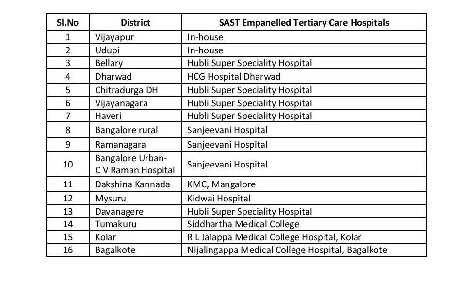 ಡೇ ಕೇರ್ ಕೀಮೋಥೆರಪಿ ಕೇಂದ್ರಗಳಿಗಾಗಿ ಹಬ್-ಅಂಡ್-ಸ್ಟೋಕ್ ಮಾದರಿಯಲ್ಲಿ SAST ನೊಂದಯಿತ ತೃತೀಯ ಹಂತದ ಆಸ್ಪತ್ರೆಗಳು ಮತ್ತು ಜಿಲ್ಲಾ ಆಸ್ಪತ್ರೆಗಳಿಗೆ ಸ್ಪಷ್ಟ ಜವಾಬ್ದಾರಿಗಳನ್ನು ವ್ಯಾಖ್ಯಾನಿಸುವ ಮೂಲಕ ಕ್ಯಾನ್ಸರ್ ಆರೈಕೆಯನ್ನು ಖಚಿತಪಡಿಸುವುದು, ಕರ್ನಾಟಕದಲ್ಲಿ, ಇದನ್ನು ತೃತೀಯ ಹಂತದ ಆಸ್ಪತ್ರೆಗಳು ಮತ್ತು ಜಿಲ್ಲಾ ಆಸ್ಪತ್ರೆಗಳಲ್ಲಿ ಡೇ ಕೇರ್ ಕೀಮೋಥೆರಪಿ ಕೇಂದ್ರಗಳ ನಡುವಿನ ಒಪ್ಪಂದದ ಮೂಲಕ ಸ್ಥಾಪಿಸಲಾಗಿದೆ. ಪ್ರಸ್ತಾವಿತ ಪಟ್ಟಿಯನ್ನು ಅನುಬಂಧ 1 ರಲ್ಲಿ ಲಗತ್ತಿಸಲಾಗಿದೆ.