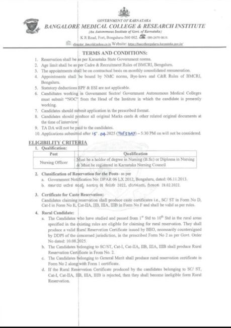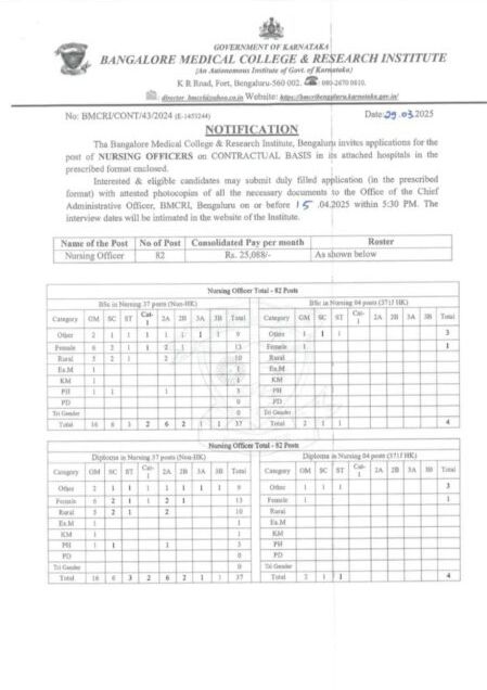 ಬೆಂಗಳೂರು ವೈದ್ಯಕೀಯ ಕಾಲೇಜು ಮತ್ತು ಸಂಶೋಧನಾ ಸಂಸ್ಥೆಯು ತನ್ನ ಆಸ್ಪತ್ರೆಗಳಲ್ಲಿ ಗುತ್ತಿಗೆ ಆಧಾರದ ಮೇಲೆ ನರ್ಸಿಂಗ್ ಆಫೀಸರ್ ಹುದ್ದೆಗಳನ್ನು ಭರ್ತಿ ಮಾಡಲು ನಿಗದಿತ ನಮೂನೆಯಲ್ಲಿ ಅರ್ಜಿಗಳನ್ನು ಆಹ್ವಾನಿಸಿದೆ.