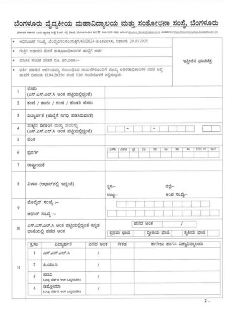 ಆಸಕ್ತ ಮತ್ತು ಅರ್ಹ ಅಭ್ಯರ್ಥಿಗಳು ಸರಿಯಾಗಿ ಭರ್ತಿ ಮಾಡಿದ ಅರ್ಜಿಯನ್ನು (ನಿಗದಿತ ನಮೂನೆಯಲ್ಲಿ) ಎಲ್ಲಾ ಅಗತ್ಯ ದಾಖಲೆಗಳ ದೃಢೀಕರಿಸಿದ ಫೋಟೋಕಾಪಿಗಳೊಂದಿಗೆ 15.04.2025 ರಂದು ಸಂಜೆ 5:30 ರೊಳಗೆ ಮುಖ್ಯ ಆಡಳಿತಾಧಿಕಾರಿಗಳ ಕಚೇರಿ, ಬಿಎಂಸಿಆರ್ಐ, ಬೆಂಗಳೂರು ಇವರಿಗೆ ಸಲ್ಲಿಸಬಹುದು. ಸಂದರ್ಶನದ ದಿನಾಂಕಗಳನ್ನು ಸಂಸ್ಥೆಯ ವೆಬ್ಸೈಟ್ನಲ್ಲಿ ತಿಳಿಸಲಾಗುತ್ತದೆ.