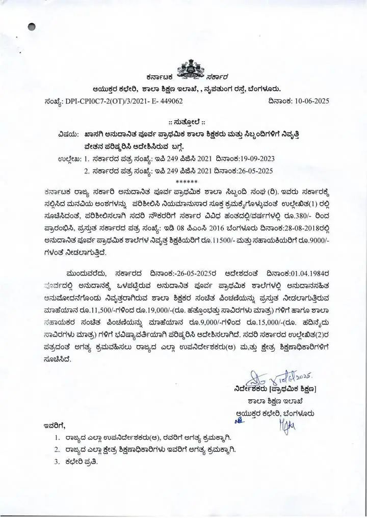ಮುಂದುವರೆದು, ಸರ್ಕಾರದ ದಿನಾಂಕ:-26-05-2025ರ ಆದೇಶದಂತೆ ದಿನಾಂಕ:01.04.1984ರ ಪೂರ್ವದಲ್ಲಿ ಅನುದಾನಕ್ಕೆ ಒಳಪಟ್ಟಿರುವ ಅನುದಾನಿತ ಪೂರ್ವ ಪ್ರಾಥಮಿಕ ಶಾಲೆಗಳಲ್ಲಿ ಅನುದಾನಸಹಿತ ಅನುಮೋದನೆಗೊಂಡು ನಿವೃತ್ತರಾಗಿರುವ ಶಾಲಾ ಶಿಕ್ಷಕರ ಸಂಚಿತ ಪಿಂಚಣಿಯನ್ನು ಪ್ರಸ್ತುತ ನೀಡಲಾಗುತ್ತಿರುವ ಮಾಹೆಯಾನ ರೂ.11,500/-ಗಳಿಂದ ರೂ.19,000/-(ರೂ. ಹತ್ತೊಂಭತ್ತು ಸಾವಿರಗಳು ಮಾತ್ರ) ಗಳಿಗೆ ಹಾಗೂ ಶಾಲಾ ಸಹಾಯಕರ ಸಂಚಿತ ಪಿಂಚಣಿಯನ್ನು ಮಾಹೆಯಾನ ರೂ.9,000/-ಗಳಿಂದ ರೂ.15,000/-(ರೂ. ಹದಿನೈದು ಸಾವಿರಗಳು ಮಾತ್ರ) ಗಳಿಗೆ ಭವಿಷ್ಯಾವರ್ತಿಯಾಗಿ ಪರಿಷ್ಕರಿಸಿ ಆದೇಶಿಸಲಾಗಿದೆ. ಸದರಿ ಸರ್ಕಾರದ ಉಲ್ಲೇಖಿತ(2)ರ ಪತ್ರದಂತೆ ಅಗತ್ಯ ಕ್ರಮವಹಿಸಲು ರಾಜ್ಯದ ಎಲ್ಲಾ ಉಪನಿರ್ದೇಶಕರು(ಆ) ಮತ್ತು ಕ್ಷೇತ್ರ ಶಿಕ್ಷಣಾಧಿಕಾರಿಗಳಿಗೆ ಸೂಚಿಸಿದೆ.