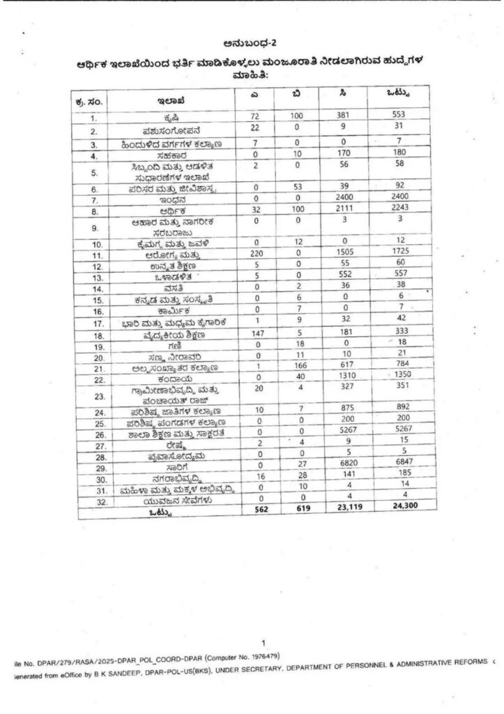 ಕರ್ನಾಟಕ ರಾಜ್ಯ ಸರ್ಕಾರವು 2025-26ನೇ ಸಾಲಿನಲ್ಲಿ ರಾಜ್ಯದ ಸರ್ಕಾರಿ ಹಾಗೂ ಅರೆ ಸರ್ಕಾರಿ ವಿವಿಧ ಇಲಾಖೆಗಳಲ್ಲಿ ಖಾಲಿ ಇರುವ ಹುದ್ದೆಗಳ ಕುರಿತು ವಿಧಾನಸಭೆಗೆ ಅಧಿಕೃತ ಮಾಹಿತಿಯನ್ನು ನೀಡಿದೆ. ಇಲಾಖೆವಾರು ಖಾಲಿ ಹುದ್ದೆಗಳ ಸಂಖ್ಯೆ ಹಾಗೂ ನೇಮಕಾತಿಗೆ ಸರ್ಕಾರದಿಂದ ಅನುಮೋದನೆ ದೊರೆತಿರುವ ಹುದ್ದೆಗಳ ವಿವರಗಳನ್ನು ಬಹಿರಂಗಪಡಿಸಲಾಗಿದೆ.