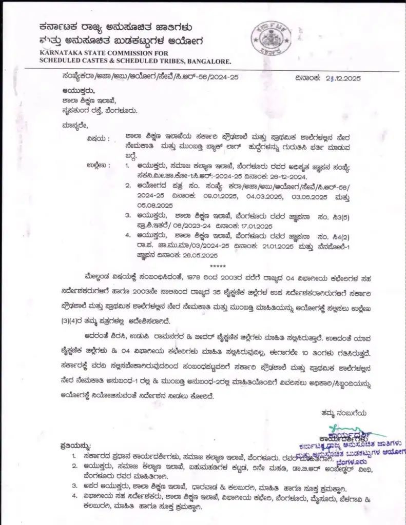 ಬೆಂಗಳೂರು: ಶಾಲಾ ಶಿಕ್ಷಣ ಇಲಾಖೆಯ ಅಧೀನದಲ್ಲಿರುವ ಸರ್ಕಾರಿ ಪ್ರೌಢಶಾಲೆ ಮತ್ತು ಪ್ರಾಥಮಿಕ ಶಾಲೆಗಳಲ್ಲಿನ ನೇರ ನೇಮಕಾತಿ ಹಾಗೂ ಮುಂಬಡ್ತಿ ಬ್ಯಾಕ್‌ಲಾಗ್ ಹುದ್ದೆಗಳನ್ನು ಗುರುತಿಸಿ ತ್ವರಿತವಾಗಿ ಭರ್ತಿ ಮಾಡಬೇಕು ಎಂದು ಕರ್ನಾಟಕ ರಾಜ್ಯ ಅನುಸೂಚಿತ ಜಾತಿಗಳು ಮತ್ತು ಅನುಸೂಚಿತ ಬುಡಕಟ್ಟುಗಳ ಆಯೋಗವು ಶಾಲಾ ಶಿಕ್ಷಣ ಇಲಾಖೆ ಆಯುಕ್ತರಿಗೆ ಪತ್ರ ಬರೆದಿದೆ.