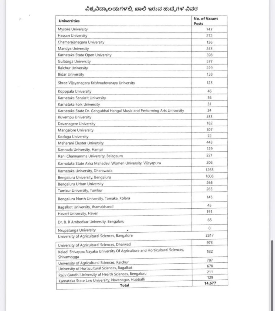 ಬೆಂಗಳೂರು: ರಾಜ್ಯ ಸರ್ಕಾರವು ರಾಜ್ಯದ ವಿವಿಧ ವಿಶ್ವವಿದ್ಯಾಲಯಗಳಲ್ಲಿ ಖಾಲಿ ಇರುವ ಹುದ್ದೆಗಳ ವಿವರಗಳನ್ನು ಪ್ರಕಟಿಸಿದೆ. ಪ್ರಕಟಿತ ಮಾಹಿತಿಯಂತೆ, ರಾಜ್ಯದ ವಿವಿಧ ವಿಶ್ವವಿದ್ಯಾಲಯಗಳಲ್ಲಿ ಒಟ್ಟು 14,677 ಹುದ್ದೆಗಳು ಖಾಲಿ ಇದ್ದು, ಉನ್ನತ ಶಿಕ್ಷಣ ಕ್ಷೇತ್ರದಲ್ಲಿ ಗಂಭೀರ ಮಾನವ ಸಂಪನ್ಮೂಲ ಕೊರತೆ ಎದುರಾಗಿರುವುದು ಬೆಳಕಿಗೆ ಬಂದಿದೆ.