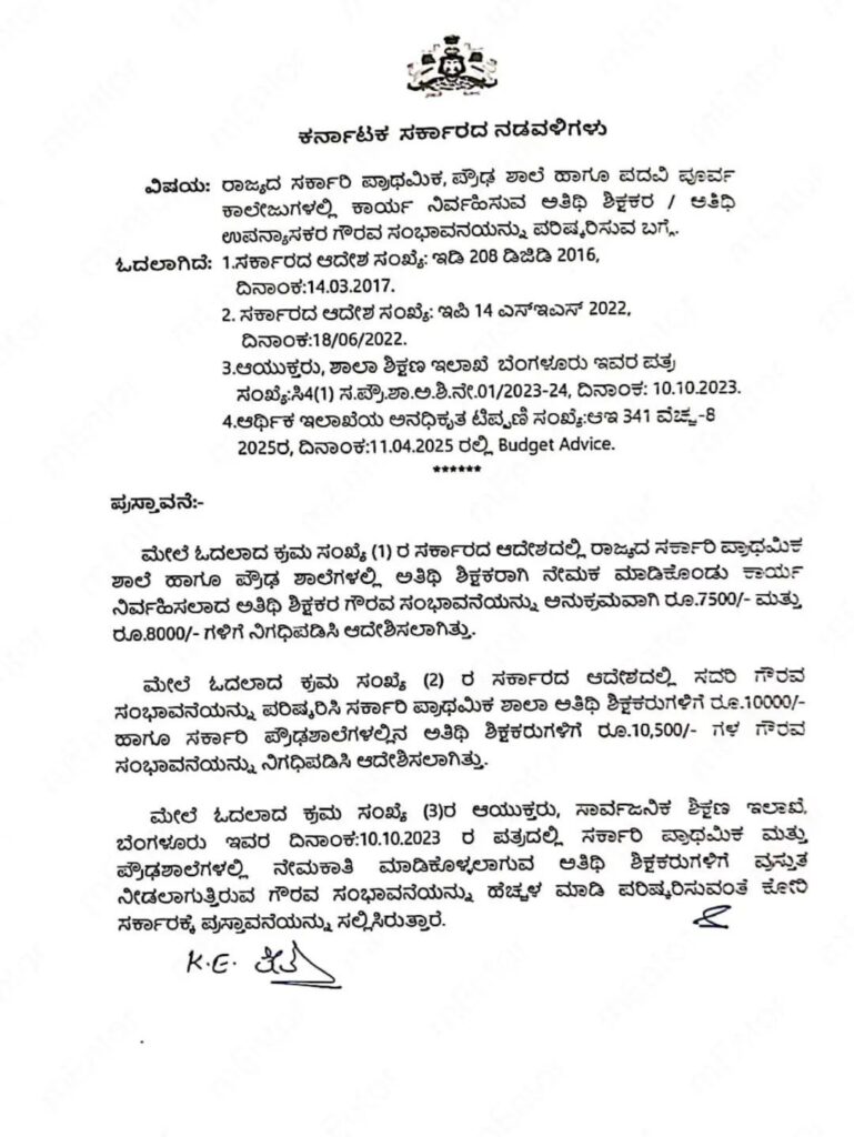 ಪುಸ್ತಾವನೆಯಲ್ಲಿ ವಿವರಿಸಿರುವ ಅಂಶಗಳ ಹಿನ್ನೆಲೆಯಲ್ಲಿ ರಾಜ್ಯದ ಸರ್ಕಾರಿ ಪ್ರಾಥಮಿಕ ಹಾಗೂ ಪ್ರೌಢಶಾಲೆ / ಪದವಿಪೂರ್ವ ಕಾಲೇಜುಗಳಲ್ಲಿ ಖಾಲಿಯಿರುವ ಬೋಧಕ ಹುದ್ದೆಗಳ ಎದುರಾಗಿ ವಿದ್ಯಾರ್ಥಿಗಳ ಶೈಕ್ಷಣಿಕ ಹಿತದೃಷ್ಟಿಯಿಂದ ನೇಮಕಾತಿ ಮಾಡಿಕೊಳ್ಳಲಾಗುತ್ತಿರುವ ಅತಿಥಿ ಶಿಕ್ಷಕರು / ಅತಿಥಿ ಉಪನ್ಯಾಸಕರುಗಳ ಗೌರವ ಸಂಭಾವನೆಯನ್ನು ತಕ್ಷಣದಿಂದ ಜಾರಿಗೆ ಬರುವಂತೆ ಹಾಗೂ ಮುಂದಿನ ಆದೇಶದವರೆಗೆ ಈ ಕೆಳಕಂಡಂತೆ ವರಿಷ್ಕರಿಸಿ ಆದೇಶಿಲಾಗಿದೆ ಎಂದು ತಿಳಿಸಿದ್ದಾರೆ.