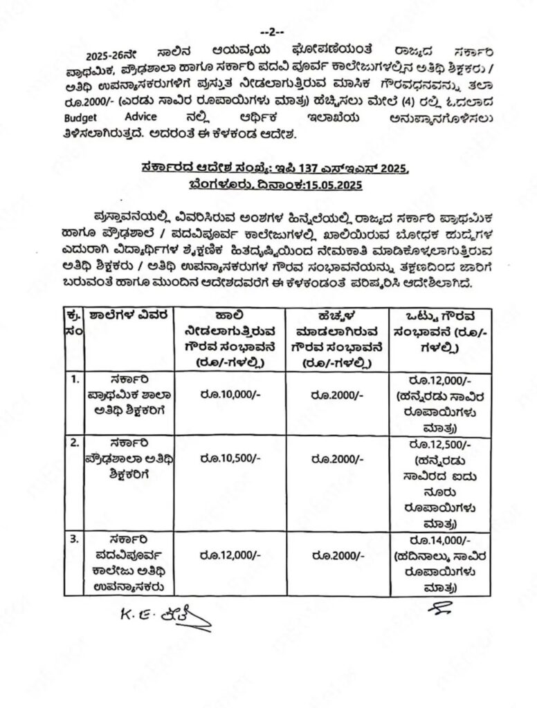 2025-26 ಸಾಲಿನ ಆಯವ್ಯಯ ಘೋಷಣೆಯಂತೆ ರಾಜ್ಯದ ಸರ್ಕಾರಿ ಪ್ರಾಥಮಿಕ, ಪ್ರೌಢಶಾಲಾ ಹಾಗೂ ಸರ್ಕಾರಿ ಪದವಿ ಪೂರ್ವ ಕಾಲೇಜುಗಳಲ್ಲಿನ ಅತಿಥಿ ಶಿಕ್ಷಕರು / ಅತಿಥಿ ಉಪನ್ಯಾಸಕರುಗಳಿಗೆ ಪುಸ್ತುತ ನೀಡಲಾಗುತ್ತಿರುವ ಮಾಸಿಕ ಗೌರವಧನವನ್ನು ತಲಾ ರೂ.2000/- (ಎರಡು ಸಾವಿರ ರೂಪಾಯಿಗಳು ಮಾತ್ರ ಹೆಚ್ಚಿಸಲು ಮೇಲೆ (4) ರಲ್ಲಿ ಓದಲಾದ Budget Advice ನಲ್ಲಿ ಆರ್ಥಿಕ ಇಲಾಖೆಯ ತಿಳಿಸಲಾಗಿರುತ್ತದೆ. ಅದರಂತೆ ಈ ಕೆಳಕಂಡ ಆದೇಶಿದ್ದಾರೆ.