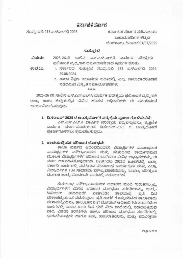 ಈ ಕುರಿತಂತೆ ಶಾಲಾ ಶಿಕ್ಷಣ ಇಲಾಖೆಯಿಂದ ಸುತ್ತೋಲೆ ಹೊರಡಿಸಿದ್ದು, 2025-26 ನೇ ಸಾಲಿನ ಎಸ್.ಎಸ್.ಎಲ್.ಸಿ ವಾರ್ಷಿಕ ಪರೀಕ್ಷೆಯ ಫಲಿತಾಂಶ ವೃದ್ಧಿಗಾಗಿ ರಾಜ್ಯ ಹಾಗು ಜಿಲ್ಲೆಯಲ್ಲಿನ ವಿವಿಧ ಹಂತದ ಅಧಿಕಾರಿಗಳು ಈ ಮುಂದಿನಂತೆ ಕಾರ್ಯನಿರ್ವಹಿಸುವುದು.