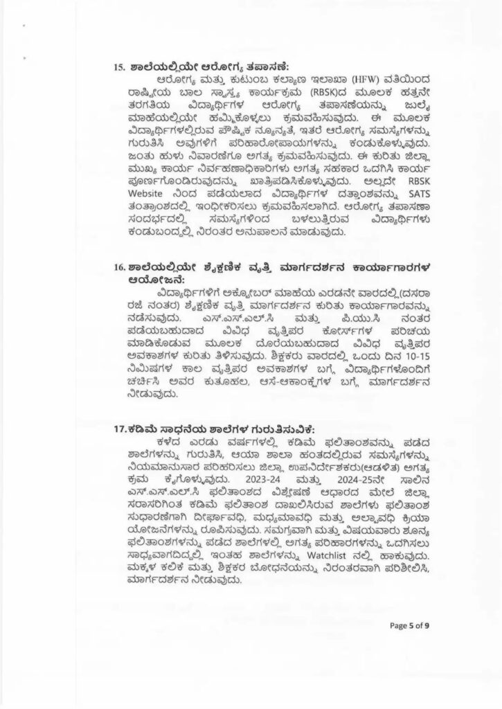 ಆರೋಗ್ಯ ಮತ್ತು ಕುಟುಂಬ ಕಲ್ಯಾಣ ಇಲಾಖಾ (HFW) ವತಿಯಿಂದ ರಾಷ್ಟ್ರೀಯ ಬಾಲ ಸ್ವಾಸ್ಥ್ಯ ಕಾರ್ಯಕ್ರಮ (RBSK)ದ ಮೂಲಕ ಹತ್ತನೇ ತರಗತಿಯ ವಿದ್ಯಾರ್ಥಿಗಳ ಆರೋಗ್ಯ ತಪಾಸಣೆಯನ್ನು ಜುಲೈ ಮಾಹೆಯಲ್ಲಿಯೇ ಹಮ್ಮಿಕೊಳ್ಳಲು ಕ್ರಮವಹಿಸುವುದು. ಈ ಮೂಲಕ ವಿದ್ಯಾರ್ಥಿಗಳಲ್ಲಿರುವ ಪೌಷ್ಟಿಕ ನ್ಯೂನ್ಯತೆ, ಇತರೆ ಆರೋಗ್ಯ ಸಮಸ್ಯೆಗಳನ್ನು ಗುರುತಿಸಿ ಅವುಗಳಿಗೆ ಪರಿಹಾರೋಪಾಯಗಳನ್ನು ಕಂಡುಕೊಳ್ಳುವುದು. ಜಂತು ಹುಳು ನಿವಾರಣೆಗೂ ಅಗತ್ಯ ಕ್ರಮವಹಿಸುವುದು. ಈ ಕುರಿತು ಜಿಲ್ಲಾ ಮುಖ್ಯ ಕಾರ್ಯ ನಿರ್ವಹಣಾಧಿಕಾರಿಗಳು ಅಗತ್ಯ ಸಹಕಾರ ಒದಗಿಸಿ ಕಾರ್ಯ ಪೂರ್ಣಗೊಂಡಿರುವುದನ್ನು ಖಾತ್ರಿಪಡಿಸಿಕೊಳ್ಳುವುದು. ಅಲ್ಲದೇ RBSK Website ನಿಂದ ಪಡೆಯಲಾದ ವಿದ್ಯಾರ್ಥಿಗಳ ದತ್ತಾಂಶವನ್ನು SATS ತಂತ್ರಾಂಶದಲ್ಲಿ ಇಂಧೀಕರಿಸಲು ಕ್ರಮವಹಿಸಲಾಗಿದೆ. ಆರೋಗ್ಯ ತಪಾಸಣಾ ಸಂದರ್ಭದಲ್ಲಿ ಸಮಸ್ಯೆಗಳಿಂದ ಬಳಲುತ್ತಿರುವ ವಿದ್ಯಾರ್ಥಿಗಳು ಕಂಡುಬಂದಲ್ಲಿ ನಿರಂತರ ಅನುಪಾಲನೆ ಮಾಡುವುದು.
