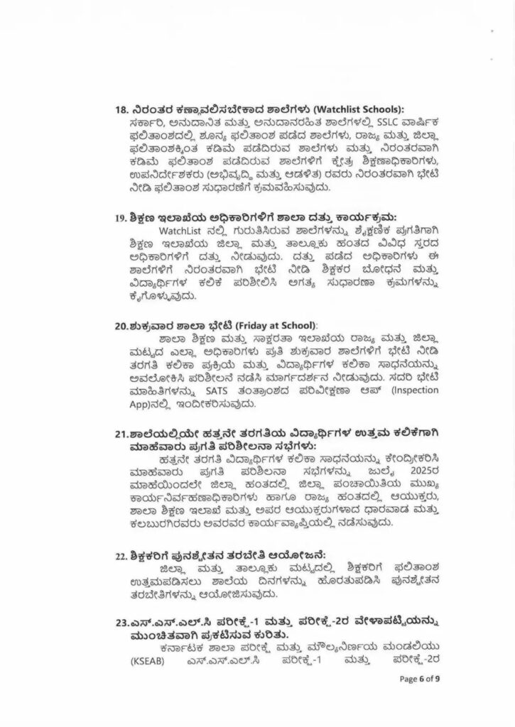 18. ನಿರಂತರ ಕಣಾವಲಿಸಬೇಕಾದ ಶಾಲೆಗಳು (Watchlist Schools): ಸರ್ಕಾರಿ, ಅನುದಾನಿತ ಮತ್ತು ಅನುದಾನರಹಿತ ಶಾಲೆಗಳಲ್ಲಿ SSLC ವಾರ್ಷಿಕ ಫಲಿತಾಂಶದಲ್ಲಿ ಶೂನ್ಯ ಫಲಿತಾಂಶ ಪಡೆದ ಶಾಲೆಗಳು, ರಾಜ್ಯ ಮತ್ತು ಜಿಲ್ಲಾ ಫಲಿತಾಂಶಕ್ಕಿಂತ ಕಡಿಮೆ ಪಡೆದಿರುವ ಶಾಲೆಗಳು ಮತ್ತು ನಿರಂತರವಾಗಿ ಕಡಿಮೆ ಫಲಿತಾಂಶ ಪಡೆದಿರುವ ಶಾಲೆಗಳಿಗೆ ಕ್ಷೇತ್ರ ಶಿಕ್ಷಣಾಧಿಕಾರಿಗಳು, ಉಪನಿರ್ದೇಶಕರು (ಅಭಿವೃದ್ಧಿ ಮತ್ತು ಆಡಳಿತ) ರವರು ನಿರಂತರವಾಗಿ ಭೇಟಿ ನೀಡಿ ಫಲಿತಾಂಶ ಸುಧಾರಣೆಗೆ ಕ್ರಮವಹಿಸುವುದು.