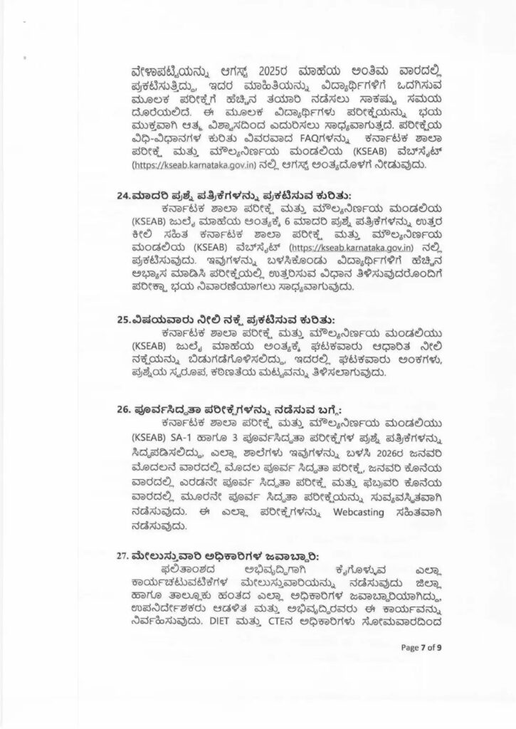 ಕರ್ನಾಟಕ ಶಾಲಾ ಪರೀಕ್ಷೆ ಮತ್ತು ಮೌಲ್ಯ ನಿರ್ಣಯ ಮಂಡಲಿಯು (KSEAB) ಪರೀಕ್ಷೆ-1 ಮತ್ತು ಪರೀಕ್ಷೆ -2ರ ವೇಳಾಪಟ್ಟಿಯನ್ನು ಆಗಸ್ಟ್ 2025ರ ಮಾಹೆಯ ಅಂತಿಮ ವಾರದಲ್ಲಿ ಪಕಟಿಸುತ್ತಿದ್ದು, ಇದರ ಮಾಹಿತಿಯನ್ನು ವಿದ್ಯಾರ್ಥಿಗಳಿಗೆ ಒದಗಿಸುವ ಮೂಲಕ ಪರೀಕ್ಷೆಗೆ ಹೆಚ್ಚಿನ ತಯಾರಿ ನಡೆಸಲು ಸಾಕಷ್ಟು ಸಮಯ ದೊರೆಯಲಿದೆ. ಈ ಮೂಲಕ ವಿದ್ಯಾರ್ಥಿಗಳು ಪರೀಕ್ಷೆಯನ್ನು ಭಯ ಮುಕ್ತವಾಗಿ ಆತ್ಮ ವಿಶ್ವಾಸದಿಂದ ಎದುರಿಸಲು ಸಾಧ್ಯವಾಗುತ್ತದೆ. ಪರೀಕ್ಷೆಯ ವಿಧಿ-ವಿಧಾನಗಳ ಕುರಿತು ವಿವರವಾದ FAQಗಳನ್ನು ಕರ್ನಾಟಕ ಶಾಲಾ ಪರೀಕ್ಷೆ ಮತ್ತು ಮೌಲ್ಯನಿರ್ಣಯ ಮಂಡಲಿಯ (KSEAB) ವೆಬ್‌ಸೈಟ್ (https://kseab.karnataka.gov.in) ನಲ್ಲಿ ಆಗಸ್ಟ್ ಅಂತ್ಯದೊಳಗೆ ನೀಡುವುದು.
