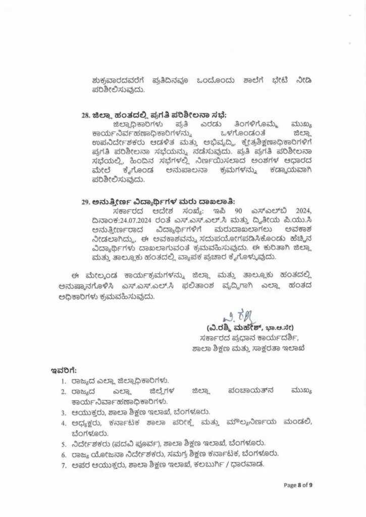 ಸರ್ಕಾರದ ಆದೇಶ ಸಂಖ್ಯೆ: ಸಂಖ್ಯೆ: ಇಪಿ 90 ಎಸ್‌ಎಲ್‌ಬಿ 2024, ದಿನಾಂಕ:24.07.2024 ರಂತೆ ಎಸ್.ಎಸ್.ಎಲ್.ಸಿ ಮತ್ತು ದ್ವಿತೀಯ ಪಿ.ಯು.ಸಿ ಅನುತ್ತೀರ್ಣರಾದ ವಿದ್ಯಾರ್ಥಿಗಳಿಗೆ ಮರುದಾಖಲಾಗಲು ಅವಕಾಶ ನೀಡಲಾಗಿದ್ದು, ಈ ಅವಕಾಶವನ್ನು ಸದುಪಯೋಗಪಡಿಸಿಕೊಂಡು ಹೆಚ್ಚಿನ ವಿದ್ಯಾರ್ಥಿಗಳು ದಾಖಲಾಗುವಂತೆ ಕ್ರಮವಹಿಸುವುದು. ಈ ಕುರಿತಾಗಿ ಜಿಲ್ಲಾ ಮತ್ತು ತಾಲ್ಲೂಕು ಹಂತದಲ್ಲಿ ವ್ಯಾಪಕ ಪುಚಾರ ಕೈಗೊಳ್ಳುವುದು.